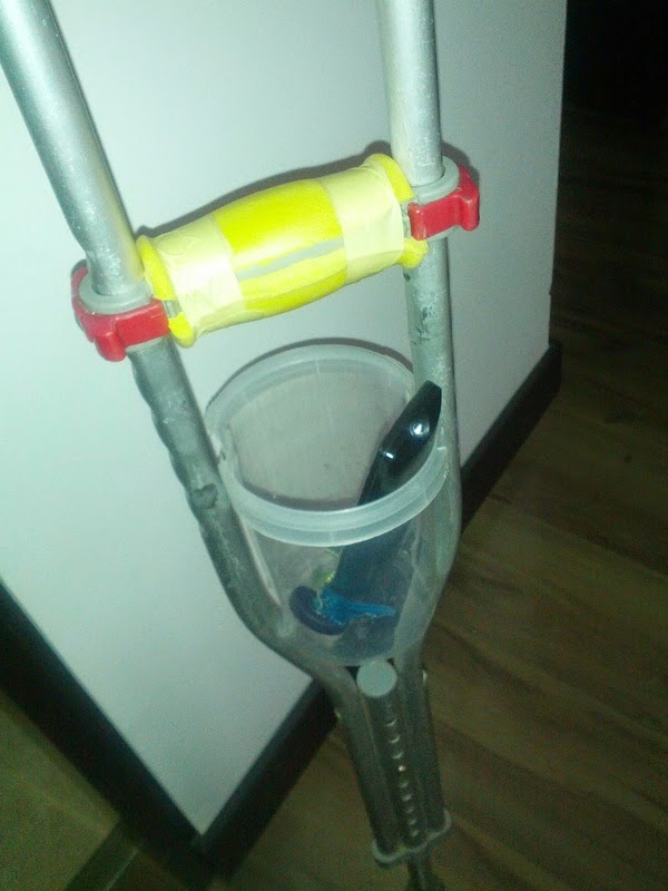 - Find a container that has a similar diameter as the space between the poles of your crutch